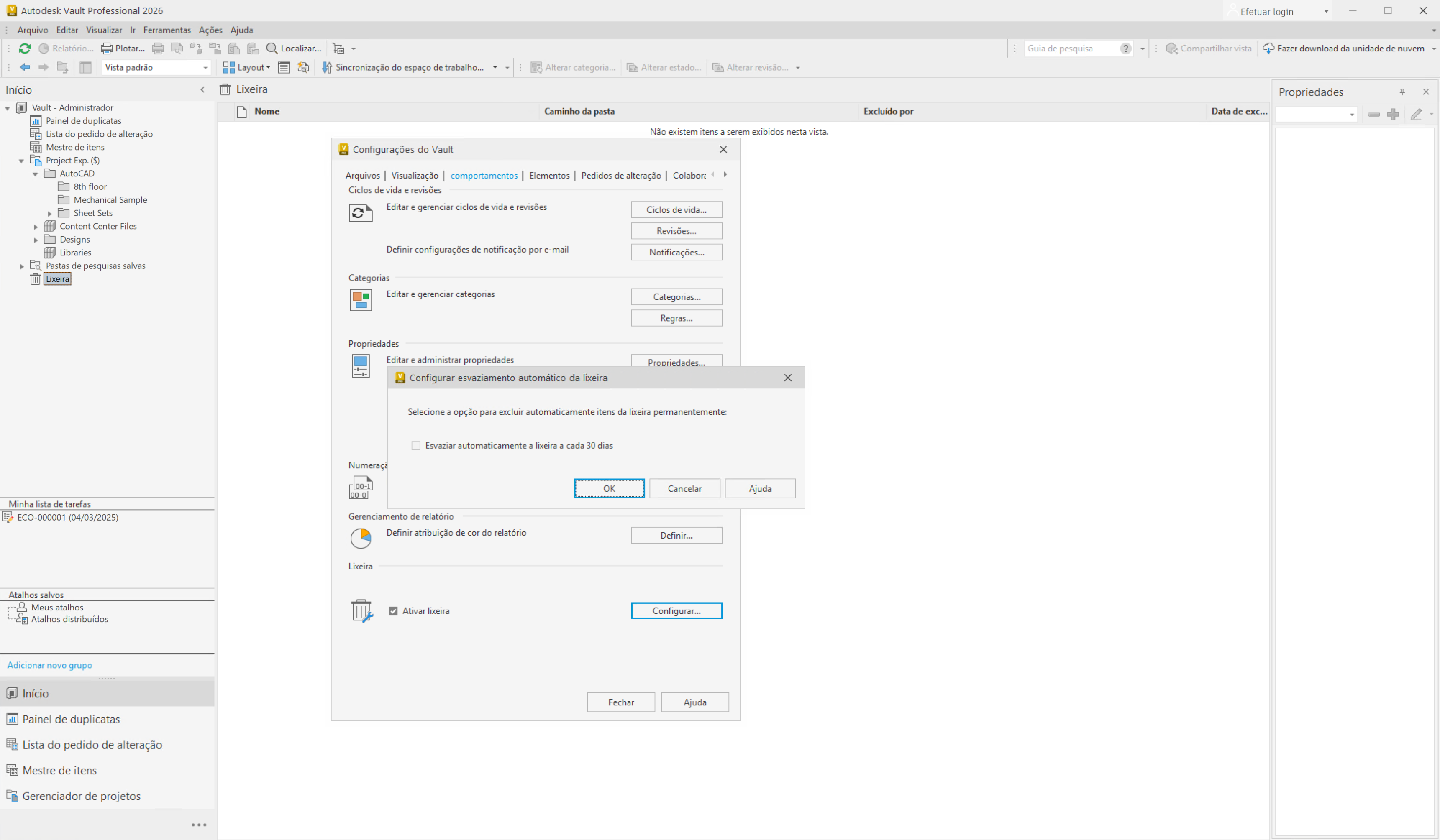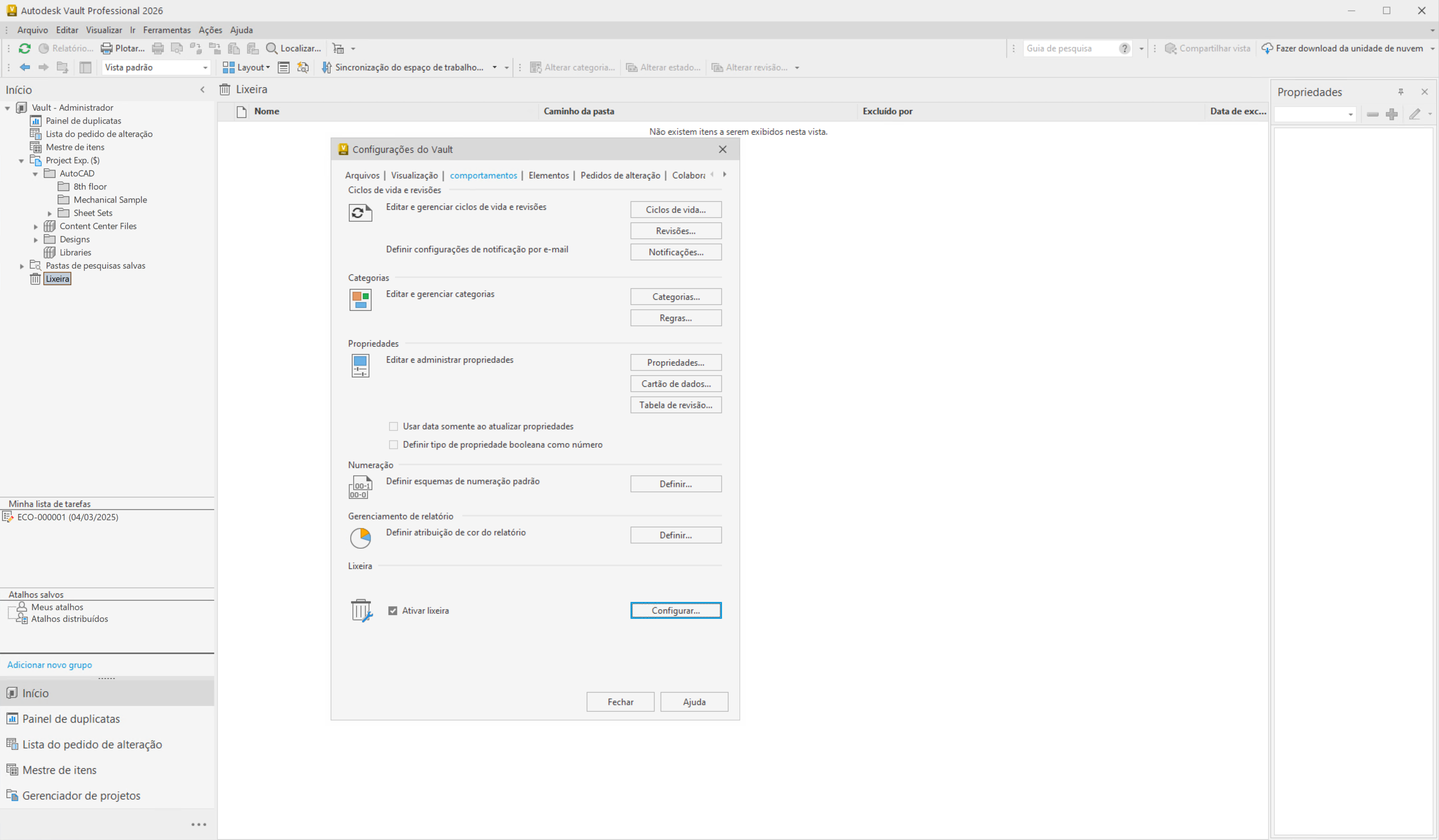 Como administrador, você pode ativar ou desativar a funcionalidade da Lixeira na guia Configurações do Vault > Comportamento. Depois que você desativar a funcionalidade da Lixeira, o fluxo de trabalho Excluir voltará a excluir o arquivo ou a pasta permanentemente.