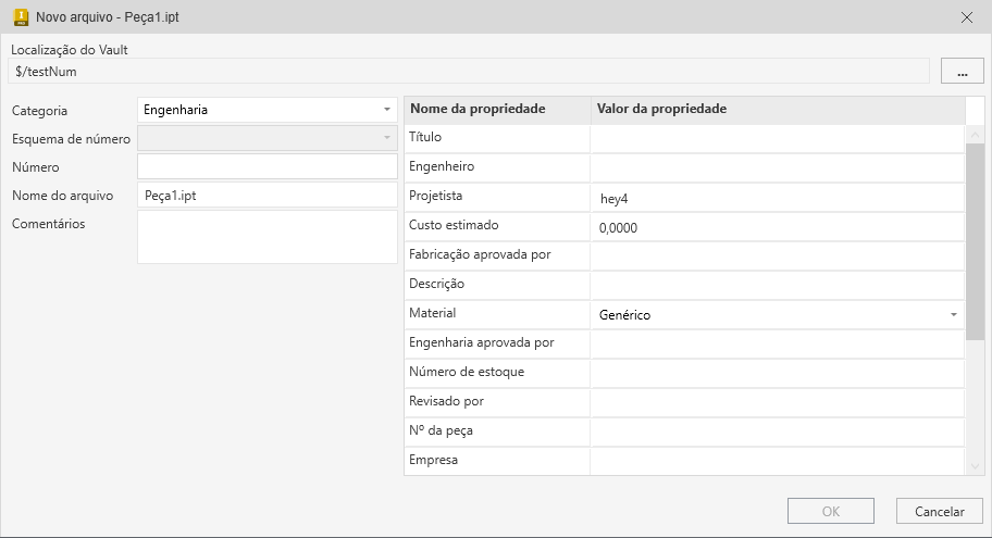 A caixa de diálogo Padrão de dados do Vault está disponível no Inventor e no AutoCAD. Quando você salva um arquivo pela primeira vez, a caixa de diálogo Padrão de dados é exibida. Preencha os campos obrigatórios e quaisquer campos adicionais definidos por seu administrador e clique em OK para salvar os dados. Os dados são salvos como uma folha de dados que pode ser modificada no futuro.