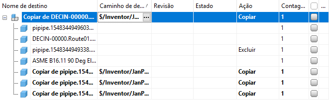 A vista principal do Copy Design mostra o nome dos arquivos disponíveis para cópia, a pasta de destino, a ação que será executada no arquivo, a revisão e o estado do arquivo e quantas instâncias (contagem) do arquivo ocorrem na lista atual. Não importa se você está duplicando um desenho, uma estrutura de projeto completa ou componentes individuais, é possível editar propriedades importantes durante o processo de cópia usando a funcionalidade intuitiva de copiar/colar ou importar diretamente do Excel.