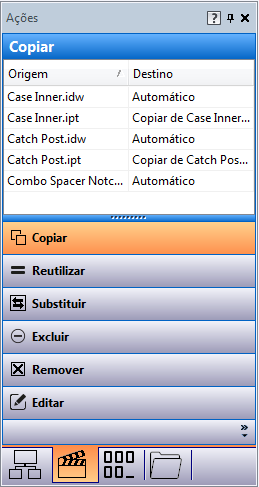 Ações | O painel Ações permite rever quais operações são atribuídas para execução em arquivos na vista principal. Uma vez que você tenha configurado os arquivos na vista principal, é possível usar o painel Ações para filtrar os arquivos com base em sua operação atribuída. As operações atribuídas incluem operações de cópia, reutilização, substituição, exclusão e edição. Observação: Você também pode definir operações de ação arrastando e soltando arquivos da grade principal no botão da operação desejada no painel Ações. Consulte Painel Ações para obter mais informações. |