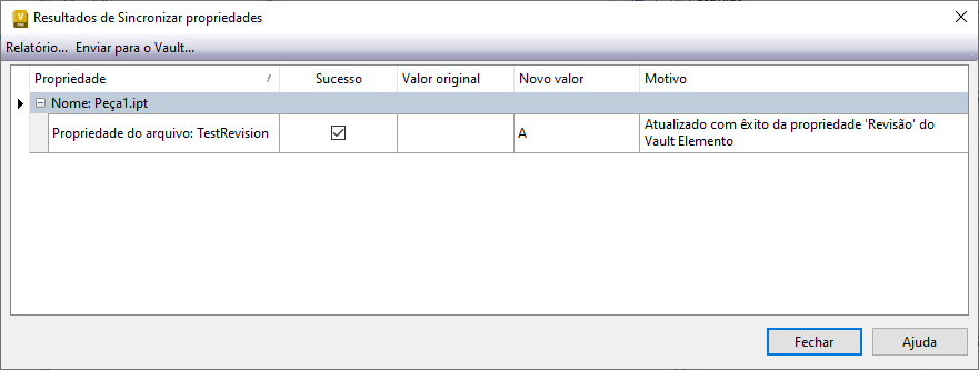 A propriedade do Inventor (propriedade personalizada) sempre será sincronizada com o item Part1 (atribuído no estado de modelo principal) e, portanto, TestRevision será revisado para a Revisão A.1 após a sincronização. Contudo, a revisão do arquivo permanecerá como Revisão A.