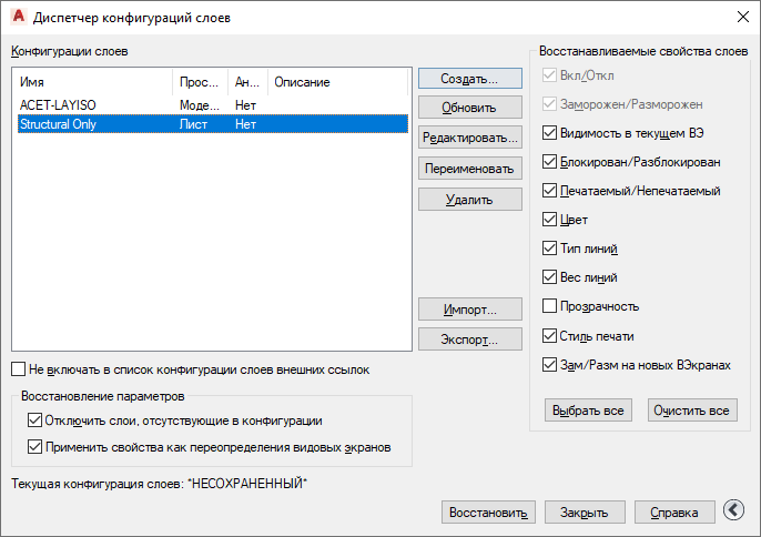 Можно сохранить настройки текущего слоя в чертеже в виде конфигурации, а затем восстанавливать эту конфигурацию. Сохранение конфигурации слоев удобно, когда есть необходимость в быстром возвращении к конкретным настройкам всех слоев в ходе различных этапов создания чертежа или для печати.
