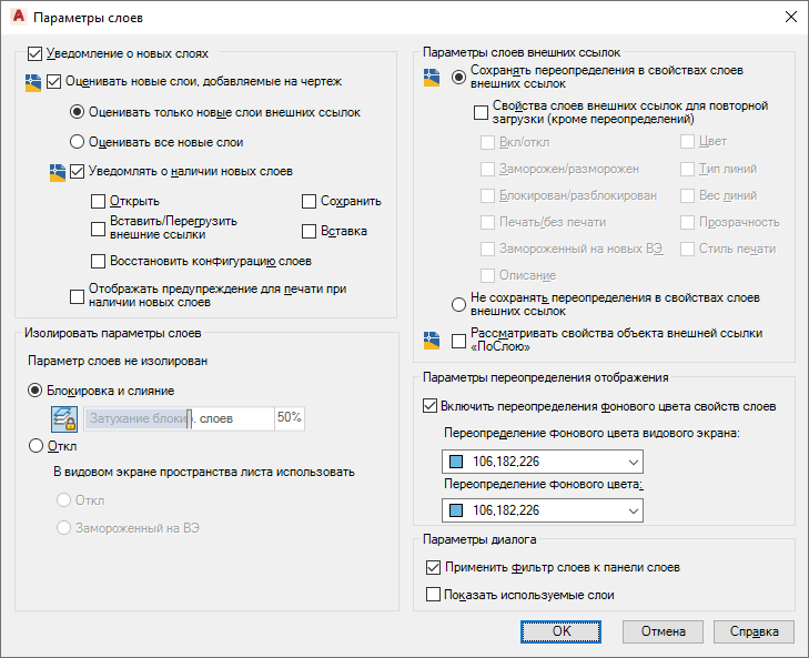 - Для настройки уведомления о новых слоях в чертеже установите флажок "Выявлять новые слои, добавляемые в чертеж".