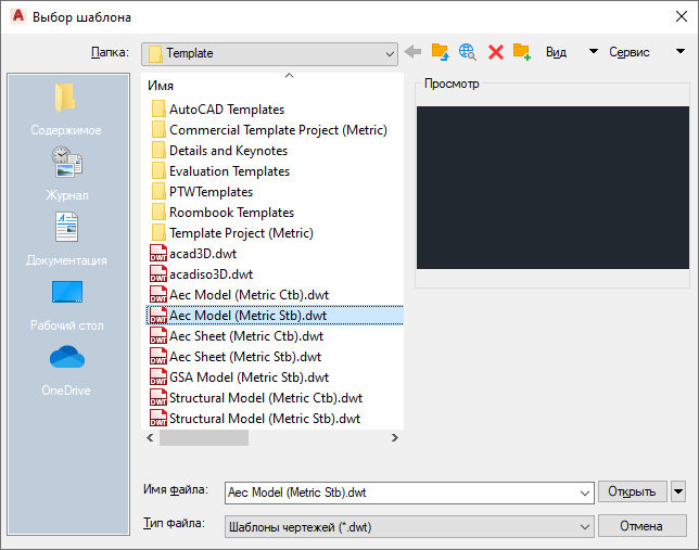 Шаблоны чертежей, поставляемые с программным обеспечением, находятся в папке C:\ProgramData\Autodesk\ACA <версия>\rus\Template. Файлы шаблонов имеют расширение DWT.