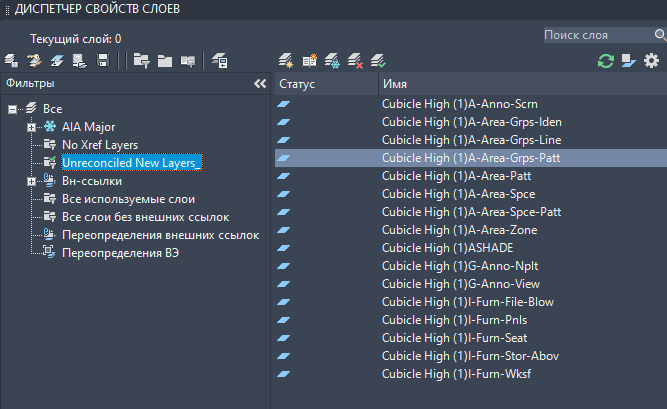 При нажатии ссылки открывается Диспетчер свойств слоев и автоматически выбирается фильтр "Несогласованные новые слои". В списке представлены все новые слои, добавленные к чертежу или файлам внешних ссылок.