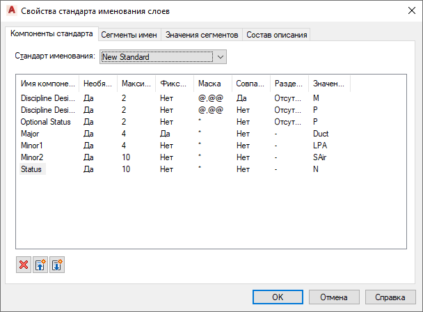 Каждый стандарт именования слоев определяет некоторое количество полей компонентов, которые составляют имя слоя, и определяет правила для содержимого, разрешенного в каждом поле. Если создается или редактируете стандарт именования слоев, осуществляется доступ к свойствам стандарта именования слоев для редактирования полей компонентов.