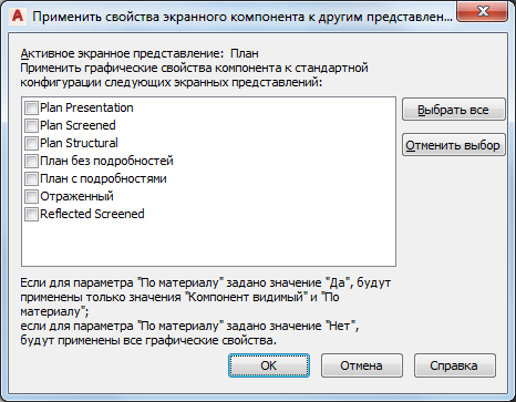 Прим.: Если параметру "По материалу" присвоено значение "Да", к выбранным экранным представлениям будет применен только этот параметр и параметр "Компонент видимый". Если параметру "По материалу" присвоено значение "Нет", к выбранным экранным представлениям будут применяться все параметры графических свойств компонента.