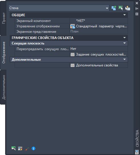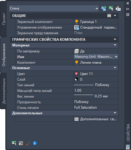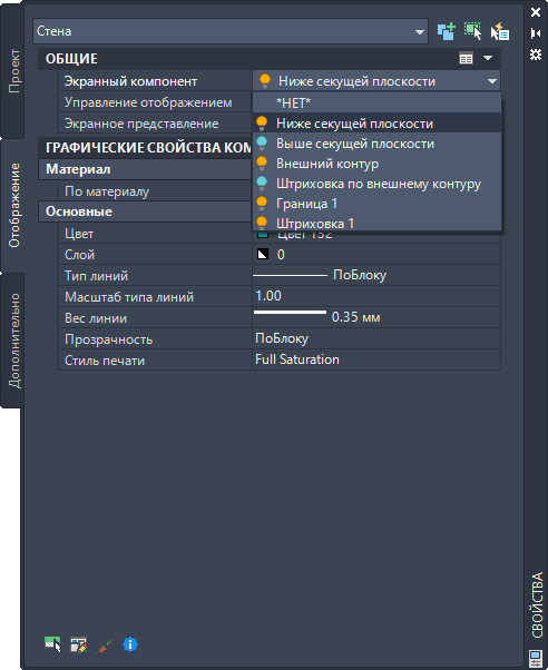 Вкладку "Отображение" палитры свойств можно использовать для изменения настроек графических свойств выбранного объекта в текущем экранном представлении. Можно изменить настройки свойств, применяемых к объекту в целом (например, "Высота секущей плоскости"), а также настройки для отдельных экранных компонентов объекта (например, "Цвет", "Слой" и "Тип линии" компонента штриховки).