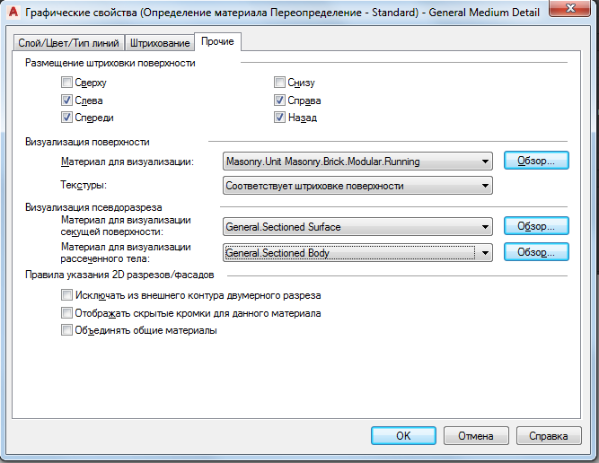 ), открывающей диалоговое окно, в котором можно просмотреть и изменить графические свойства, связанные с определением материала, например размещение штриховки поверхности и визуализацию поверхности, как показано ниже.