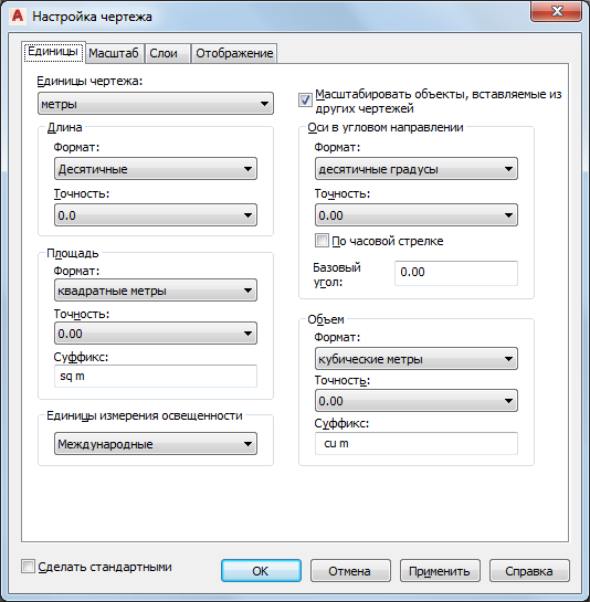 Задание стандартных параметров единиц измерения для текущего чертежа.