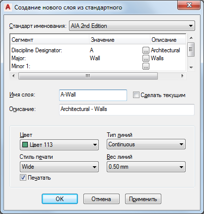 В результате, поля "Имя слоя" и "Описание" отображают выбранную вами комбинацию значений. Если, например, новый слой создан для складских стеллажей в соответствии со стандартом именования слоев BS1192, ему назначается имя A746G.