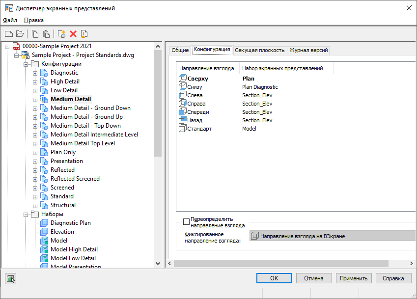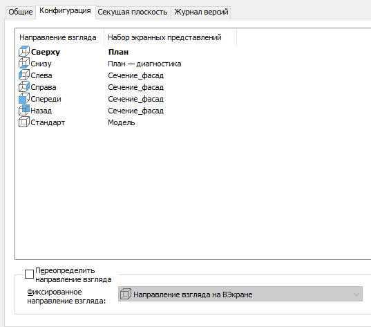 В следующем примере к направлению взгляда по умолчанию применяется набор "ЭП модель". В правой секции окна показано, что набор ЭП "Разрез_фасад" используется с направлениями взгляда "Спереди", "Снизу", "Слева" и "Справа". Набор "Экранных представлений план" используется с направлением взгляда "Сверху". В правой секции окна располагаются значки, соответствующие шести ортогональным направлениям взгляда, а также указывается направление взгляда по умолчанию.