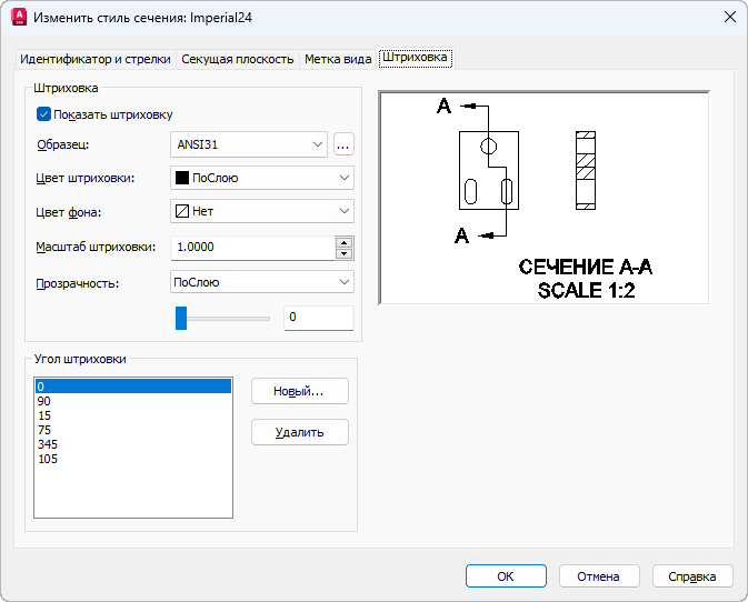 Задание списка углов, которые используются штриховкой в сечении. Первый компонент в сечении использует первую запись в списке, второй — вторую и т. д. Список должен содержать хотя бы один угол.