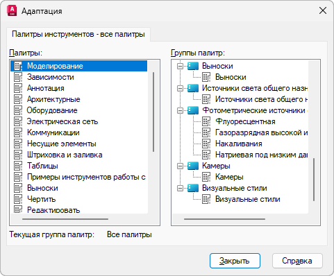 В окне «Инструментальные палитры» отображаются все доступные инструментальные палитры. Можно создавать группы палитр и управлять ими.