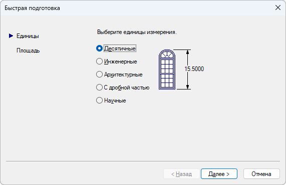 Мастер быстрой подготовки состоит из двух страниц: "Единицы" и "Область рисования". Для перемещения по страницам Мастера используются кнопки "Назад" и "Далее"; кнопка "Готово" завершает работу Мастера и создает новый чертеж с указанными параметрами.