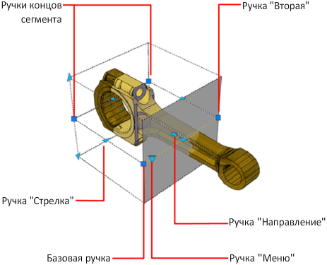 - Ручка "Стрелка". Изменение объекта-сечения путем изменения формы и расположения секущей плоскости. Разрешены только ортогональные перемещения в направлении, указанном стрелкой. (Только для режимов "Контур сечения" и "Объем сечения").