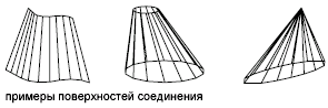Сеть соединения строится в виде полигональной сети 2 x N. Команда П-СОЕД размещает половину вершин сети с равными интервалами вдоль одной определяющей кривой, а остальные вершины - с равными интервалами вдоль другой кривой. Число интервалов определяется системной переменной SURFTAB1. Оно одинаково для обеих кривых, поэтому, если длины определяющих кривых различны, расстояние между вершинами на них будет разным.