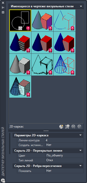 Диспетчер визуальных стилей содержит панель образцов изображений визуальных стилей, имеющихся в чертеже, и указанные ниже панели свойств.