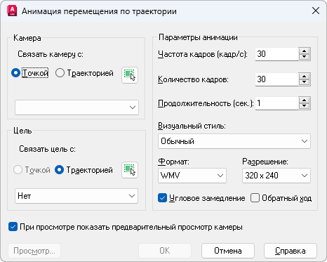 Если камера связана с траекторией, эта команда связывает цель со статической точкой на чертеже. Камера всегда будет повернута к этой точке при перемещении вдоль траектории.