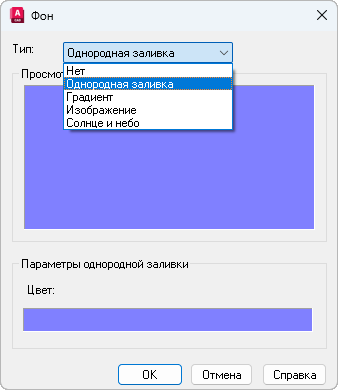 Список переопределений фона ("Нет", "Сплошной", "Градиент", "Изображение", "Солнце и небо"), которые можно применить к именованному виду.