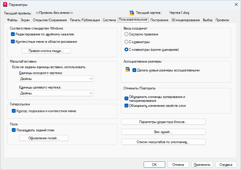 Управление доступностью контекстных меню (стандартного, режимов редактирования и команд) в области рисования. (Системная переменная SHORTCUTMENU)
