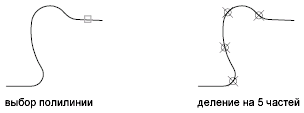 Блоки выравниваются с учетом кривизны выбранного объекта. Оси X вставляемых блоков будут касательны или коллинеарны делимому объекту в точках разделения.
