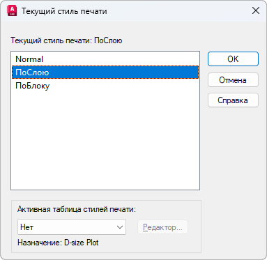 Список стилей печати, доступных для назначения объектам. Среди них стандартный стиль ОБЫЧНЫЙ. Стиль печати представляет собой совокупность переопределений для цвета, размывания, оттенков серого, присвоений перьев, интенсивности, типа и веса линий, торцов и соединений, способа заливки.