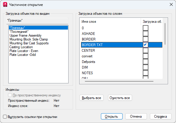 В окне отображаются списки видов и слоев, доступных для подгрузки в частично открытый чертеж.