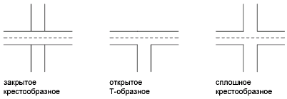 Пересечения могут быть крестообразными или T-образными; крестообразные или T-образные подразделяется на закрытые, открытые и сплошные пересечения.