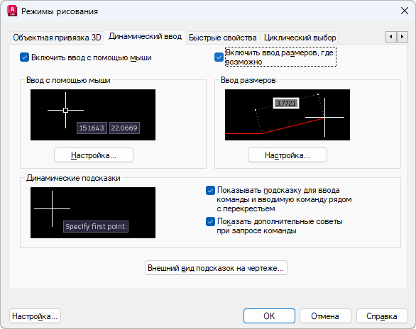 Вкладка "Динамический ввод" (диалоговое окно "Режимы рисования")