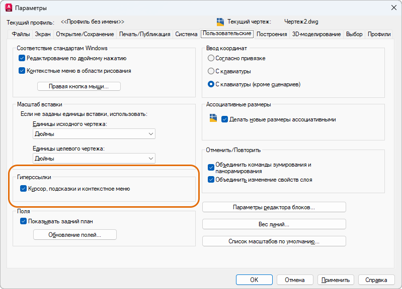 Включите отображения информации о гиперссылке на вкладке "Пользовательские установки" диалогового окна "Параметры".