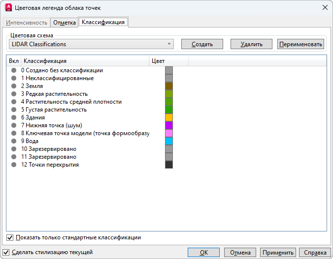 Редактирование параметров цветовой схемы для стилизации облака точек по классификации.
