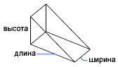 Построение клина с заданными значениями длины, ширины и высоты. Длина соответствует оси X, ширина оси Y, а высота оси Z. Выбор точки для указания длины задает также вращение в плоскости XY, в которой выполняется поворот.