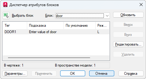 Атрибуты выбранного блока отображаются в списке атрибутов. По умолчанию в списке атрибутов отображается тег атрибута, подсказка, значение по умолчанию, режим и аннотативные свойства атрибута. Для каждого выбранного блока под списком атрибутов даны сведения о количестве вхождений блока в текущем чертеже и на текущей вкладке.