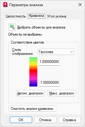 Вычисление диапазонов максимальных и минимальных значений для всех объектов, выбранных для анализа кривизны. (системные переменные VSACURVATUREHIGH и VSACURVATURELOW)