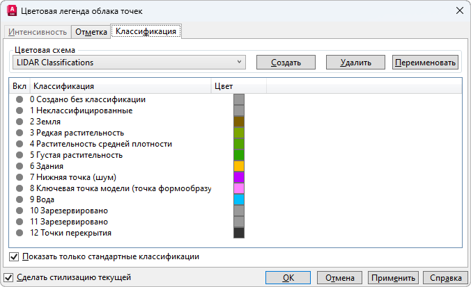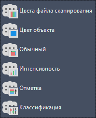 Прим.: При использовании параметров «Интенсивность», «Отметка» и «Классификация» стилизация выполняется на основе цветовых схем, назначенных в диалоговом окне «Цветовая легенда облака точек» (ОБЛАКОТОЧЕКЦВЕТЛЕГЕНД). Если требуемые данные в облаке точек отсутствуют, соответствующий параметр будет отмечен как неактивный в раскрывающемся меню стилизации.