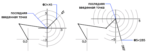 Следующий пример иллюстрирует построение двух отрезков в абсолютных полярных координатах с использованием текущего направления отсчета углов. Введите в подсказке следующее: