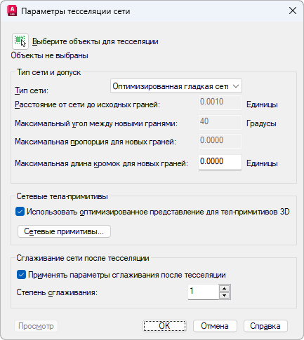 Позволяет указать параметры, используемые при преобразовании объектов твердотельных 3D-примитивов в объекты-сети.