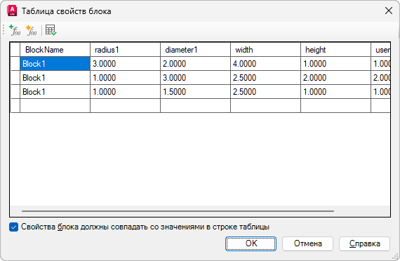В диалоговом окне "Таблица свойств блока" заголовки столбцов являются параметрами, а строки определяют значения наборов свойств. Для выбранного вхождения блока можно задать определенные значения. Для каждого определения блока может использоваться одна таблица.