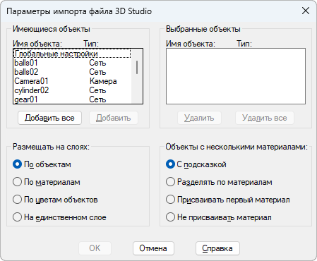 Позволяет просмотреть имеющиеся и выбранные 3D объекты, распределить объекты по слоям и задать способ обработки объектов, которым присвоено более одного материала.