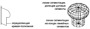 Плотность генерируемой сети управляется системными переменными SURFTAB1 и SURFTAB2. SURFTAB1 определяет количество линий табуляции, вычерчиваемых в направлении вращения. Если криволинейная траектория представляет собой отрезок, дуга, круг или сглаженная сплайном полилиния, то SURFTAB2 определяет количество линий табуляции, вычерчиваемых для ее разделения на одинаковые интервалы Если криволинейная траектория является полилинией, не сглаженной сплайном, то линии табуляции вычерчиваются по концам прямолинейных сегментов, и каждый дуговой сегмент делится на число интервалов, определяемое значением.