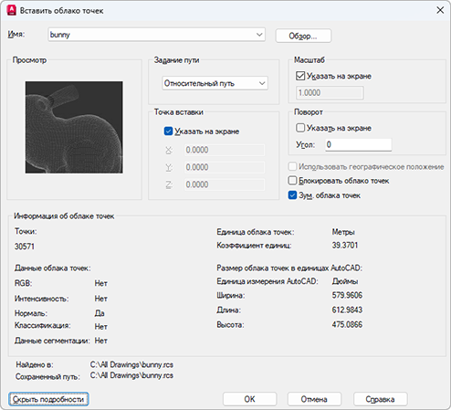 В диалоговом окне "Вставить облако точек" укажите точку вставки, масштаб и угол поворота.