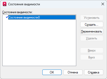 Устанавливает выбранное состояние видимости текущим для отображения в редакторе блоков. Не изменяет состояние видимости по умолчанию, которое отображается при вставке блока в чертеж, а также не изменяет отображаемое состояние видимости для вхождений блоков, вставленных и измененных в чертеже.