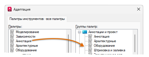 Для организации инструментальных палитр и уменьшения количества отображаемых палитр в одноименном окне можно создать и отобразить группы инструментальных палитр. Группа инструментальных палитр ограничивает количество палитр, отображаемых в окне «Инструментальные палитры». В диалоговом окне «Адаптация» содержатся параметры для создания и организации групп инструментальных палитр.