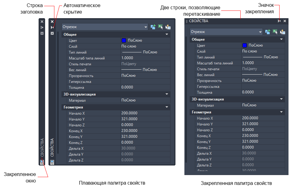 Такие окна, как лента, палитра свойств, инструментальные палитры, командная строка и Центр управления, можно пристыковать, закрепить или сделать плавающими. Изменения параметров для этих и других режимов обычно выполняются в контекстном меню, открывающемся нажатием правой кнопки на заголовке палитры или окна.