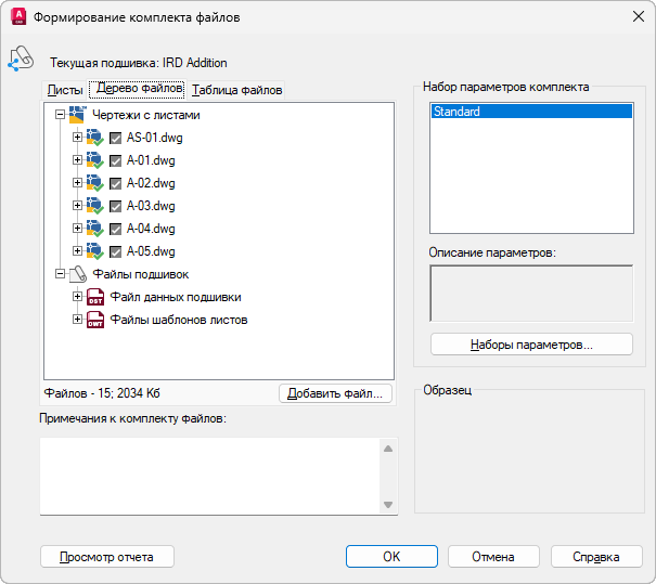 Отображение отчетных сведений о комплекте файлов. К их числу относятся заданные примечания к комплекту и автоматически сгенерированные сопроводительные примечания, информирующие о том, как правильно использовать файлы комплекта. Например, если шрифты SHX обнаружены в одном из чертежей комплекта, указывается папка, в которую следует скопировать эти файлы, чтобы их можно было найти в системе, в которой установлен комплект файлов. В отчет также включается текст пользовательских примечаний к комплекту.