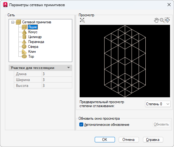 В окне просмотра отображается каркасный образец, отражающий значения параметров делений тесселяции.