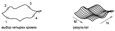 Команда П-КРОМКА выполняет построение сети, аппроксимирующей замыкающую поверхность Кунса по четырем смыкающимся кромкам. Замыкающая поверхность Кунса — это бикубическая поверхность, интерполируемая между четырьмя соседними кромками (которые, в общем случае, являются пространственными кривыми).