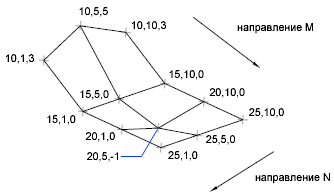 Команда 3DСЕТЬ позволяет строить полигональные сети, разомкнутые как в направлении M, так и в направлении N (по аналогии с осями X и Y плоскости XY ). В большинстве случаев команда 3DСЕТЬ применяется в комбинации с командными (пакетными) файлами AutoCAD или LISP-программами, передающими в нее координаты вершин сети.