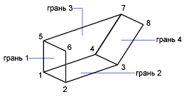 На рисунке грань 1 определяется вершинами 1, 5, 6 и 2. Грань 2 определяется вершинами 1, 4, 3 и 2. Грань 3 определяется вершинами 1, 4, 7 и 5, а грань 5 определяется вершинами 3, 4, 7 и 8.